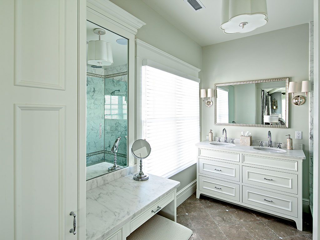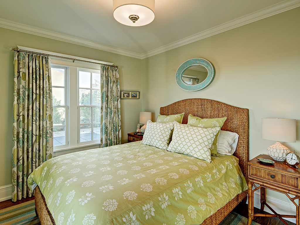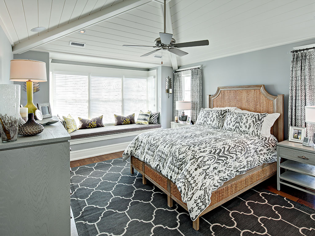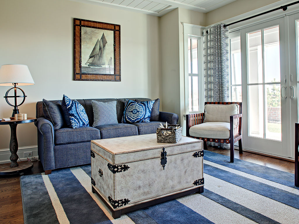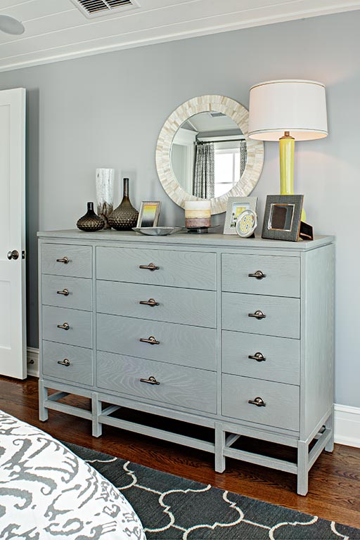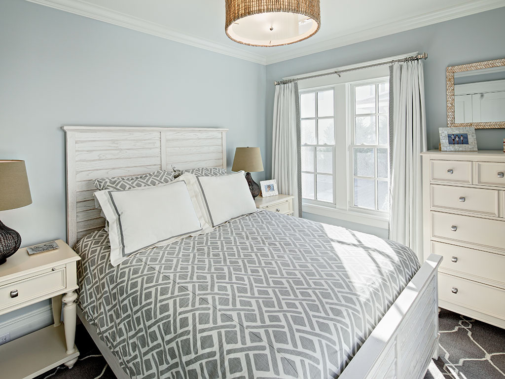 “Even indoors, thanks to Kapner’s eye, the summer sky and seaside feel is within reach at this Stone Harbor retreat, from the shipshape navy in the boys’ bunk room to the perfect paint color on the living room walls – Benjamin Moore Mountain Mist, #868, part of the company’s Classic Color Collection.”