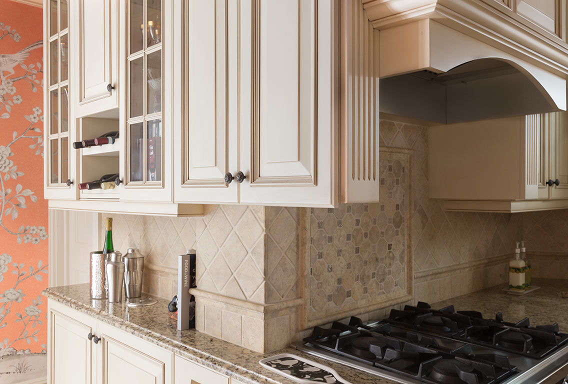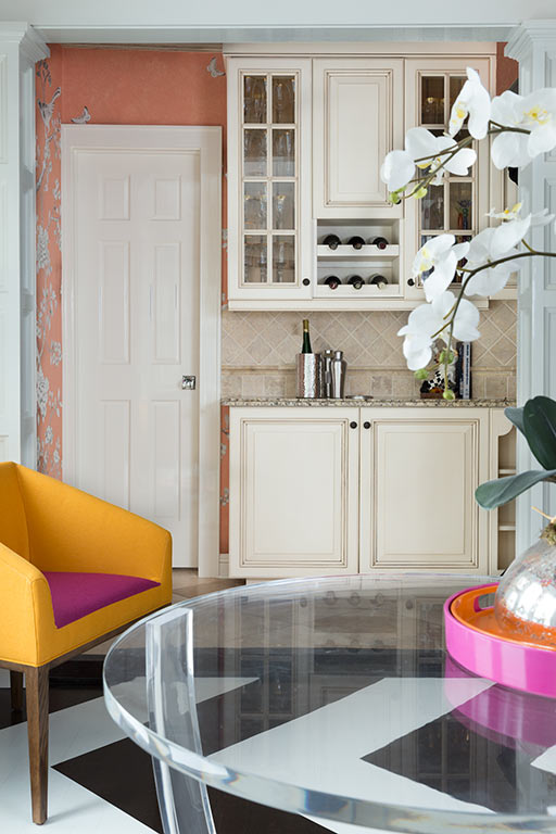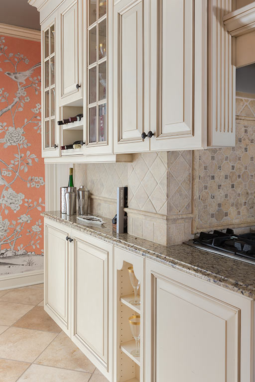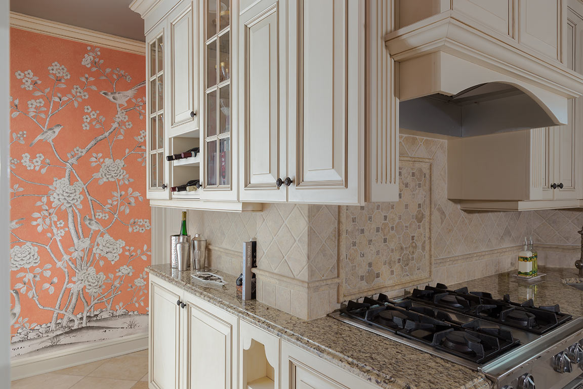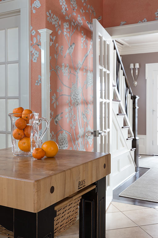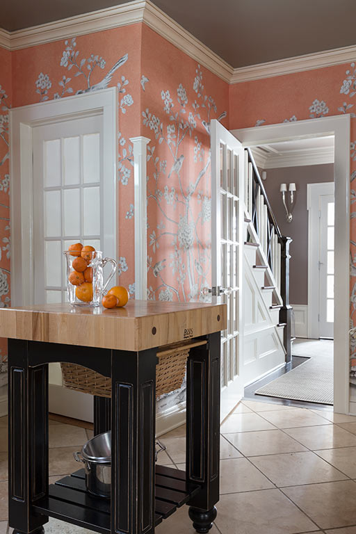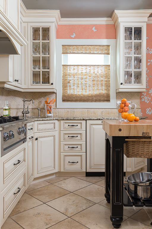 “The footprint of the kitchen is 135 square feet (although it increases to 155 square feet when counting the bar area that wraps around into the hall to the family room). So, the designer realized a plan to adapt more work space with a John Boos & Co. butcher block complete with black base and butcher block top. The custom cabinetry, from Brooks Custom Cabinetry Inc. in Union, NJ, extends to the ceiling, giving the illusion of more height and space…”